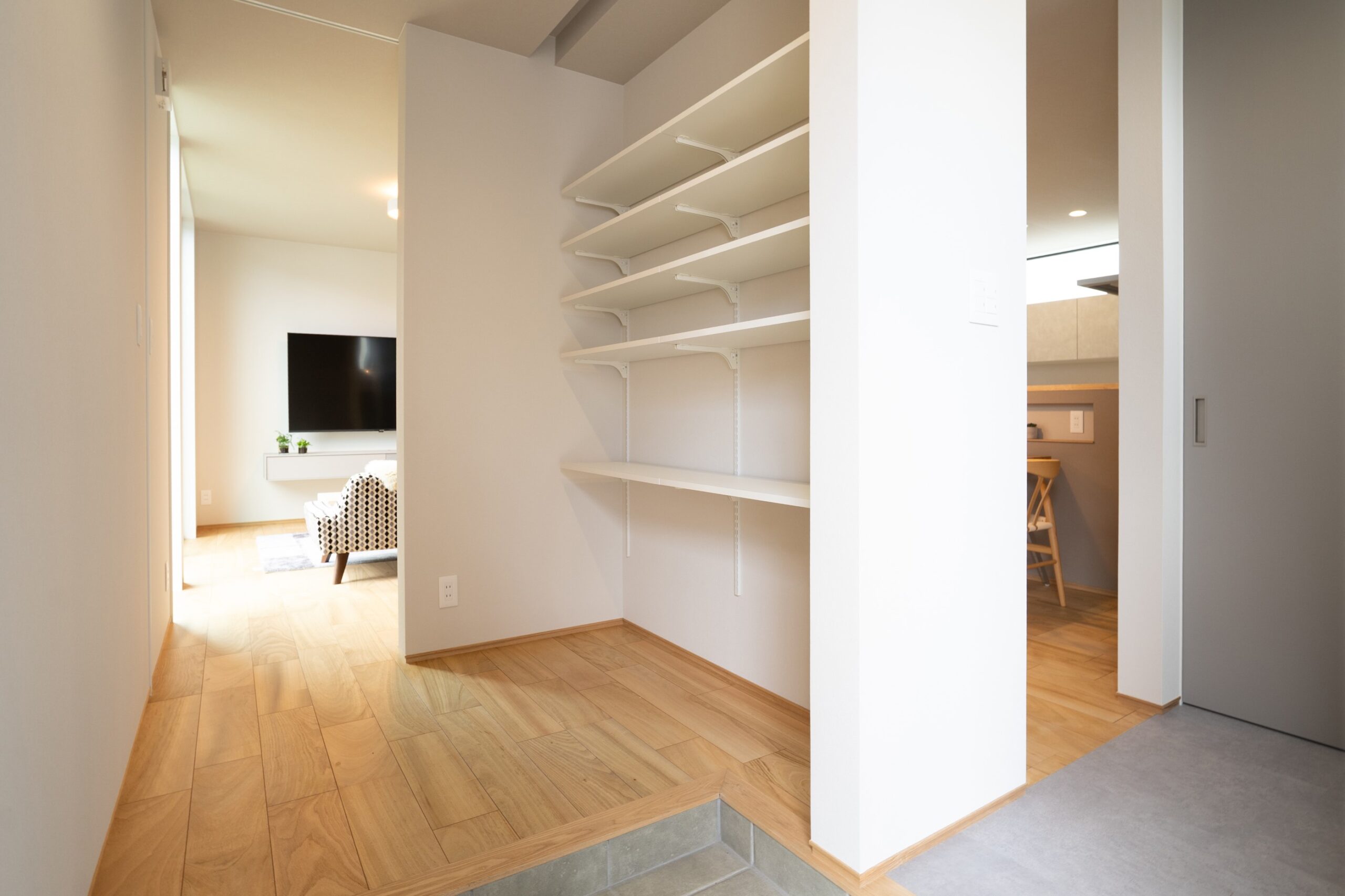 玄関からリビングと水回り、それぞれにアクセスできる二方向動線。